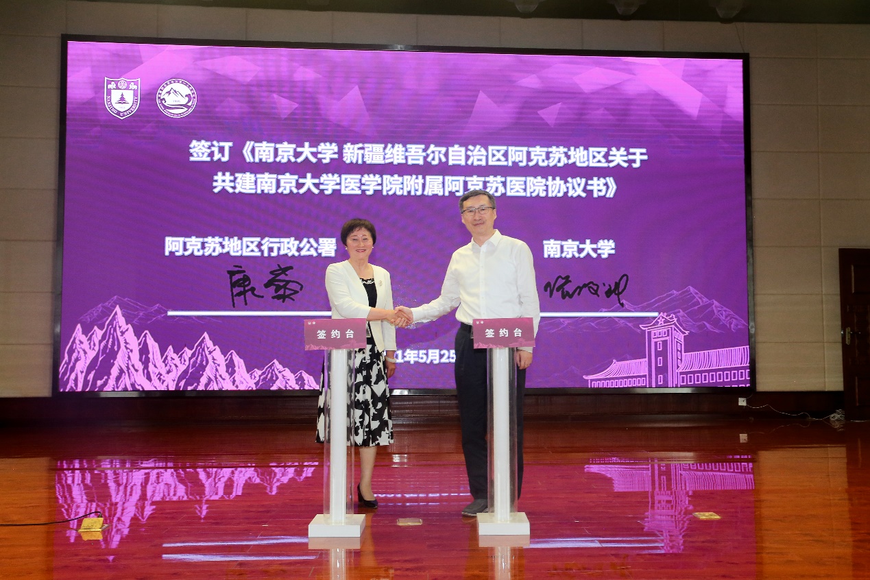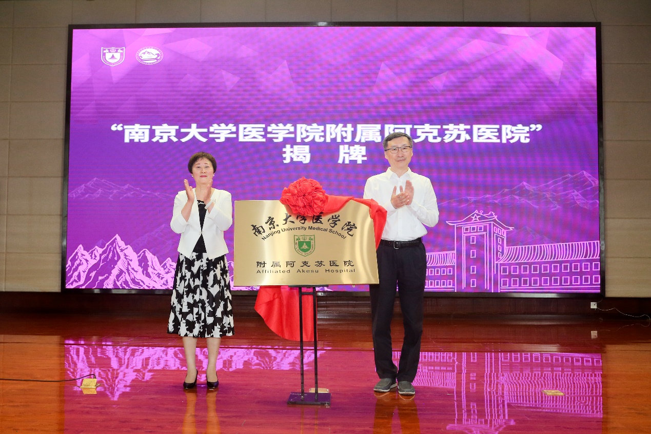 初夏五月,鲜花盛开,正值党史学习教育和庆祝建党100周年,以及BETWAY必威120周年校庆启动的重要时刻,BETWAY必威附属阿克苏医院签约揭牌仪式于5月25日在新疆维吾尔自治区阿克苏地区第一人民医院举行。这是BETWAY必威肩负国家使命、服务国家需求,秉持“真情援疆、科学援疆、持续援疆”精神,深入贯彻落实健康扶贫和医疗援疆工作的集中体现。这一重要举措必将切实推动阿克苏地区医学人才培养,促进医疗服务水平提升,为阿克苏地区人民医疗卫生保障提供“南大方案”、贡献“南大智慧”。