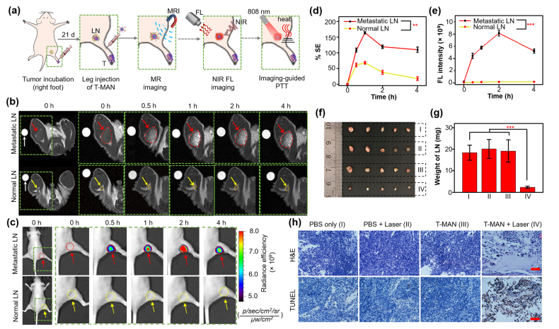 图2. 裸鼠胃癌转移淋巴结MR/荧光成像指导下的靶向光热治疗