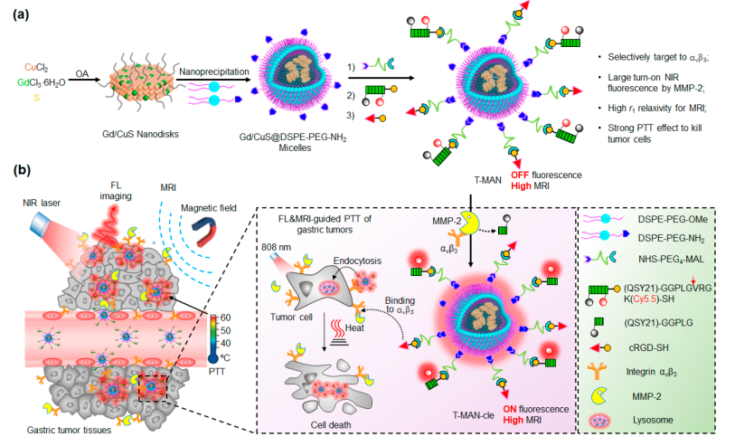 针对这一难题,BETWAY必威附属鼓楼医院医学影像科周正扬教授和BETWAY必威化学化工学院叶德举教授合作研发了一种肿瘤微环境响应性MR/荧光双模态智能纳米探针T-MAN,用于成像引导下胃癌转移淋巴结的光热治疗。该智能纳米探针具有较高的r1弛豫率(约60.0 mM-1s-1/1T)和较强的近红外荧光激活(激活倍数约185倍),并在波长808 nm激光照射下具有很高的光热转换效率(PCE, 70.1%)。