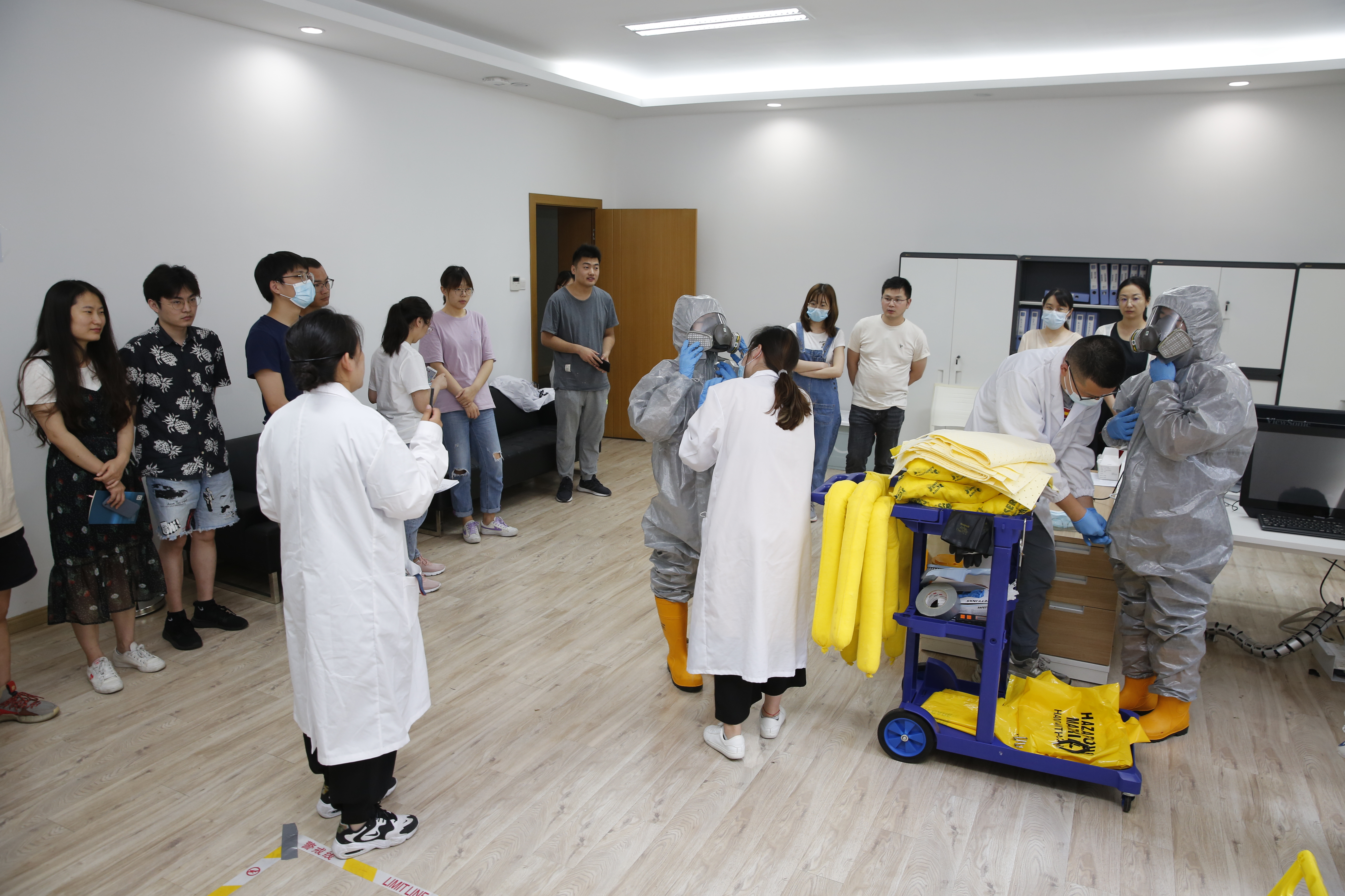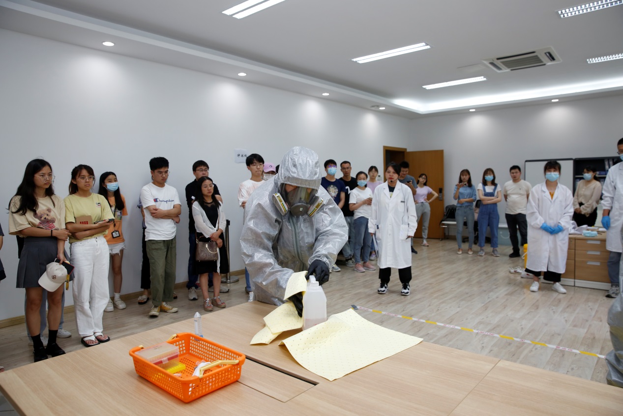 随后,“有机试剂泄露及应急处置”的安全演练通过模拟实验室乙腈泄露事故,向师生们展示了处理流程和处理规范,提高了师生在此类实验室事故发生时的应急处理和自我保护能力。