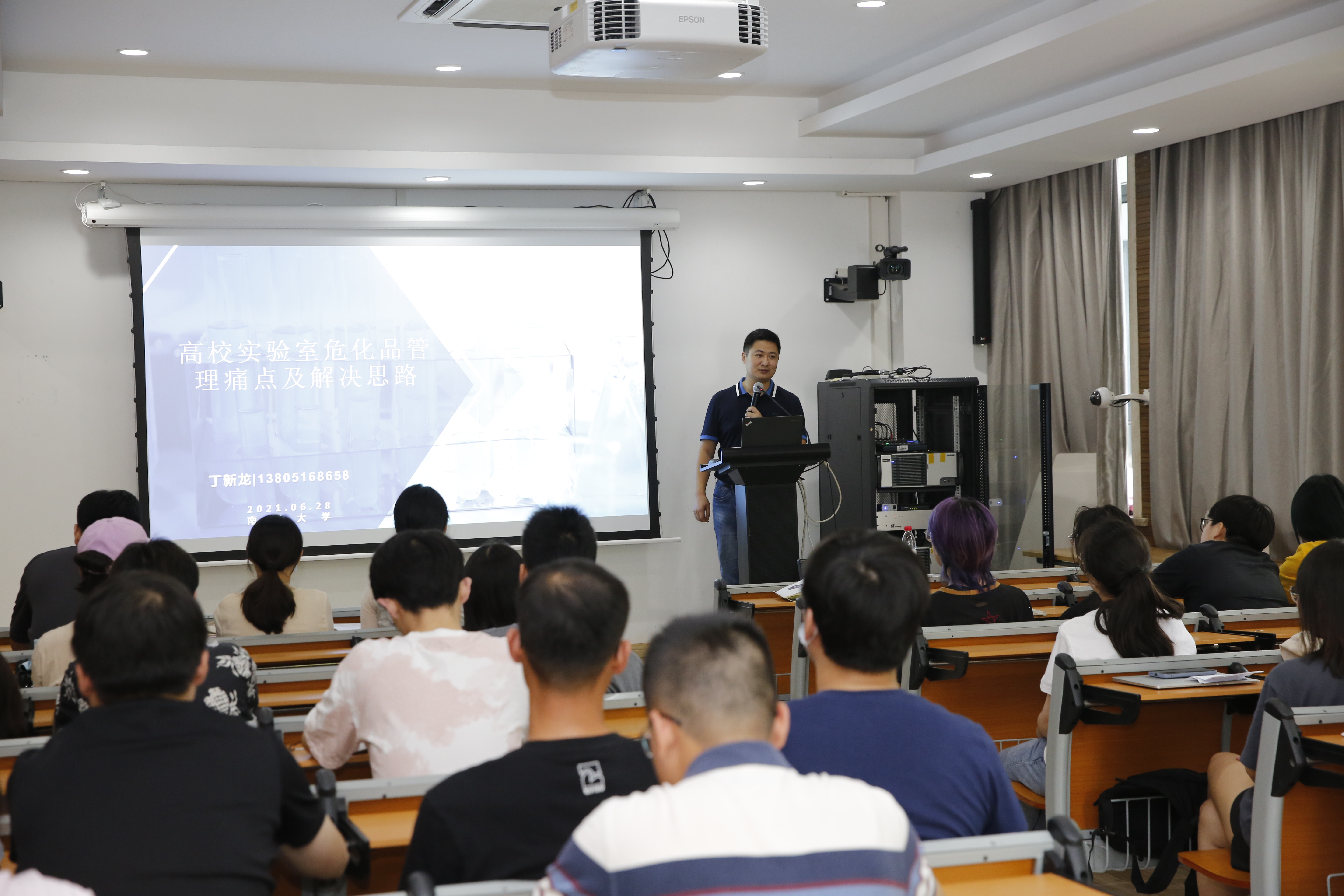 培训中,院办主任应锋结合个人经历,告诫师生们危险离我们并不遥远,必须时刻紧绷实验室安全这根弦。埃德伯格培训师丁新龙为师生们作了《实验室危化品与废弃物安全储存与科学管理》的讲座,从高校实验室安全现状分析、典型事故案例、标准法规解读、具体解决方案、典型安全隐患等角度,向师生们阐述了实验室危化品规范管理的重要性和紧迫性,并从专业角度提出了具体的指导性意见。