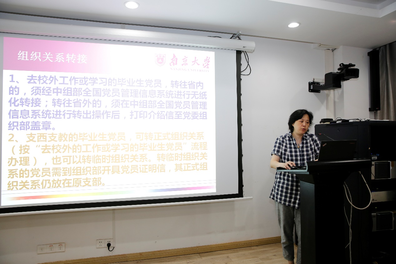 毕业生党员的组织关系转接工作是党员接受党组织的教育、管理和监督的十分重要的环节,党委秘书彭亦玲老师介绍了组织关系转接工作,就分类做好转接登记工作、员工党员组织关系转出办理流程、正确填写BETWAY必威转出党员汇总表等方面对毕业生党员提出了要求。