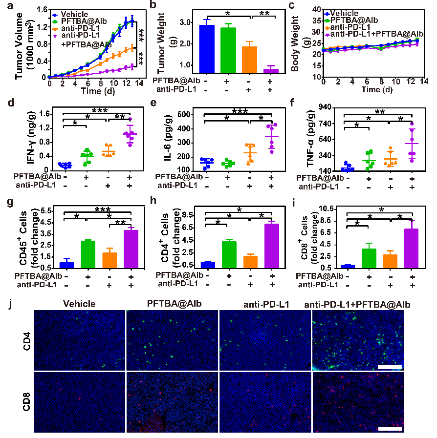 本研究表明,全氟化碳纳米粒可以有效抑制血小板功能性活化,进而有效打破血小板维持的肿瘤血管屏障,增加血管渗透性,促进T淋巴细胞在肿瘤部位的蓄积浸润,使肿瘤免疫环境得到有效改善。团队研究人员进一步将该纳米粒联合PD-L1抑制剂进行研究,发现全氟化碳纳米粒可以显著增加肿瘤部位具有免疫活性的CD4+和CD8+T细胞浸润。相较于anti-PD-L1抗体单独给药,联合给药组显著增强了anti-PD-L1抗体对肿瘤的免疫应答效应,产生了更好的抗肿瘤效果。这一研究成果将对现有的PD-L1治疗出新的思路。