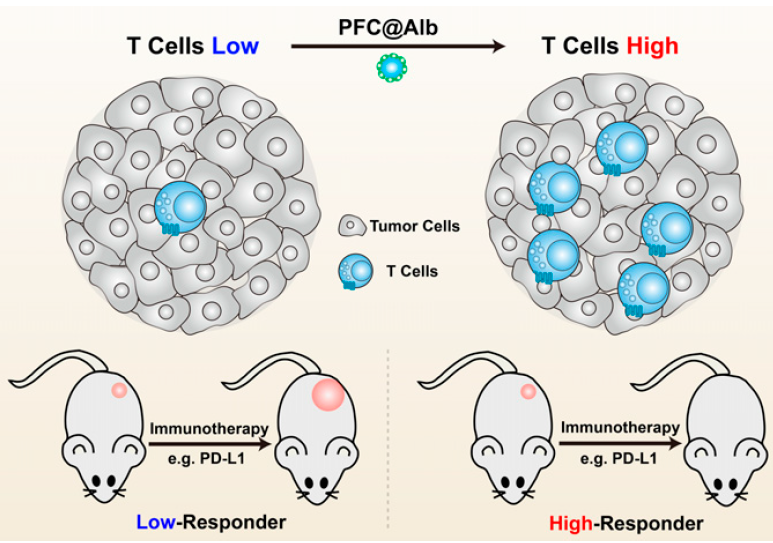近年来,以 PD-1/PD-L1抑制剂为代表的免疫疗法开创了近年来肿瘤治疗的新方向,在临床治疗中也显示出了可喜的疗效及巨大的潜能。然而,临床患者对于免疫检查点抑制剂的响应程度呈现“个体化差异”。究其根源,很多患者经历临床失败不仅仅是因为PD-1/PD-L1 抑制剂无法刺激免疫系统,很大一部分也是由于瘤内T细胞浸润不足。研究表明,临床anti-PD-L1响应程度和肿瘤患者浸润到瘤内的CD8+ T细胞数目紧密相关。因此,增加肿瘤内部T细胞浸润是实现免疫增敏的重要突破口。