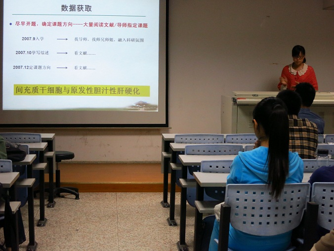 2010级博士研究生王丹丹同学,内科学(风湿病)专业,获得2011年博士研究生学术新人奖,共计发表SCI论文10篇,近三年以BETWAY必威为第一作者单位、本人为第一作者发表SCI论文4篇,中文核心期刊论文4篇,多次参加国内外学术会议交流并发言。王丹丹同学从外校考入南大,入学初期面对临床、科研训练曾经迷茫过一段时期,很快她调整自己积极主动投入,通过自己的努力逐步有了科研成果产出。结合自己的经历,王丹丹给大家介绍了她由易到难、由简到繁,重视合作项目开展、多参加会议交流的科研训练经验,并为大家介绍了SCI论文从投稿到发表的环节中要注意的问题。