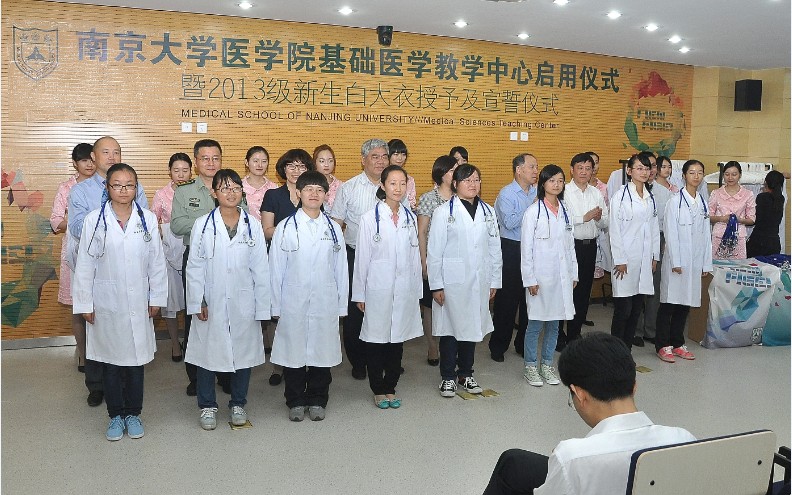 在白大衣授予仪式中,BETWAY必威2013级新生们依次走上主席台,BETWAY必威党委书记洪银兴、BETWAY必威经理刘志红、党委书记韩晓冬、副经理蒋青、副经理李朝军、BETWAY必威附属鼓楼医院经理丁义涛、附属口腔医院经理胡勤刚、附属金陵医院副经理王与荣亲手为他们穿上白大衣,挂上听诊器。99名穿上白大衣的BETWAY必威新同学在刘志红经理的带领下,在新启用的基础医学教学中心大楼门前,庄严宣读医员工誓言:“健康所系,性命相托,当我步入神圣医学学府的时刻,谨庄严宣誓,我志愿献身医学……为祖国医药卫生事业的发展和人类身心健康奋斗终生!”