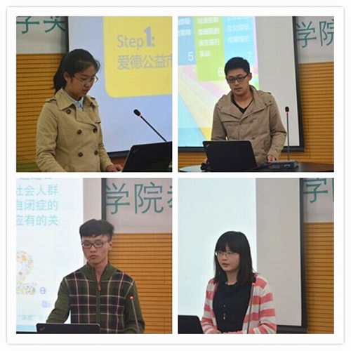 在嘉宾们精彩的发言之后,参与2014暑期社会实践的团队逐一进行了汇报分享。今年,公司共立项12支暑期社会实践团队,其中6支入选校级团队,它们分别是:“狱见温暖”公益行团队(被评为“校十佳团队”)、“纽”工作营·与你为伴--江苏省麻风康复村志愿行团队(被评为“校优秀团队”)、 “走进星星的世界”——关爱自闭症儿童的生活状况与社会诉求团队、破冰行动——医患关系调研与改善团队、扬州市宝应县河水水质检验及使用情况调查团队以及四季屋暑期社会实践团队。团队负责人们淋漓尽致地阐述分享了各自团队的实践选题、实践过程以及实践成果等,为在场嘉宾与同学们呈现了一段段生动的实践故事,赢得了现场观众热烈的掌声。