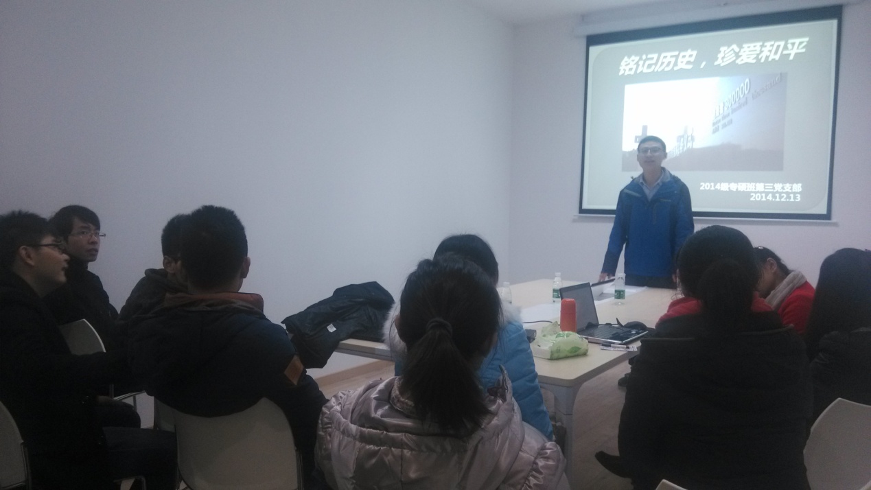 安不忘危,盛必虑衰。缅怀历史,是为了更好地前行。仙林党支部开展了以“国家公祭日”为主题的个人展示,挑选了7位同学,他们仅仅借助一张PPT,向大家展示他们关于国家公祭日的看法。做展示的同学们都强调一点,南京大屠杀是一段不能忘却的历史。警钟长鸣,不去仇恨,这是体现国人的宽宏大度。居安思危,提升自我,这是激励国人不断进步。