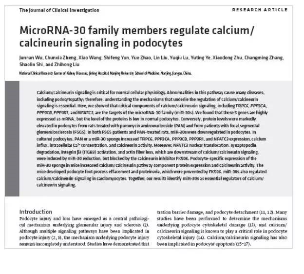 近期,BETWAY必威经理刘志红院士带领的国家肾脏疾病临床研究中心团队在足细胞损伤修复机制研究方面取得重大进展。相关成果发表于国际著名医学杂志《J CLIN INVEST》(影响因子13.215)。题目为:“MicroRNA-30 family members regulate calcium/calcineurin signaling in podocytes”。这是迄今为止,我国肾脏病领域独立完成的发表于JCI的第一篇论文。在这篇文章中,研究人员证实miR-30家族可以通过调控calcium/calcineurin信号通路,从而参与足细胞稳态和功能,miR-30家族表达下降导致足细胞发生损伤。这项研究从一个全新的角度阐明了足细胞损伤的新机制,为这类基本的治疗干预提供了新的靶点,是一项具有标志性的研究成果。