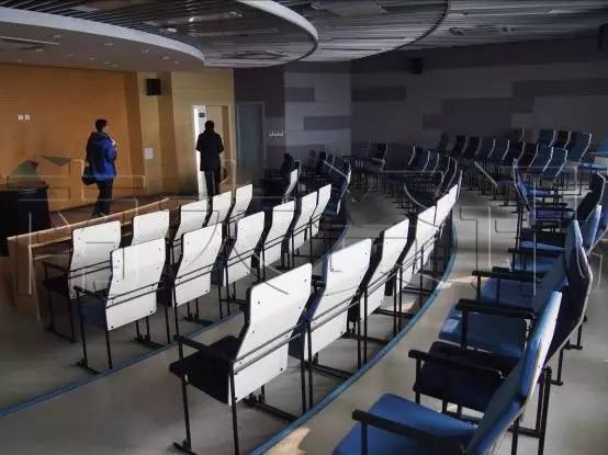 展板采用电子投影的方式,每一个书桌都配备巨幅显示屏用以连接各类网络资源。