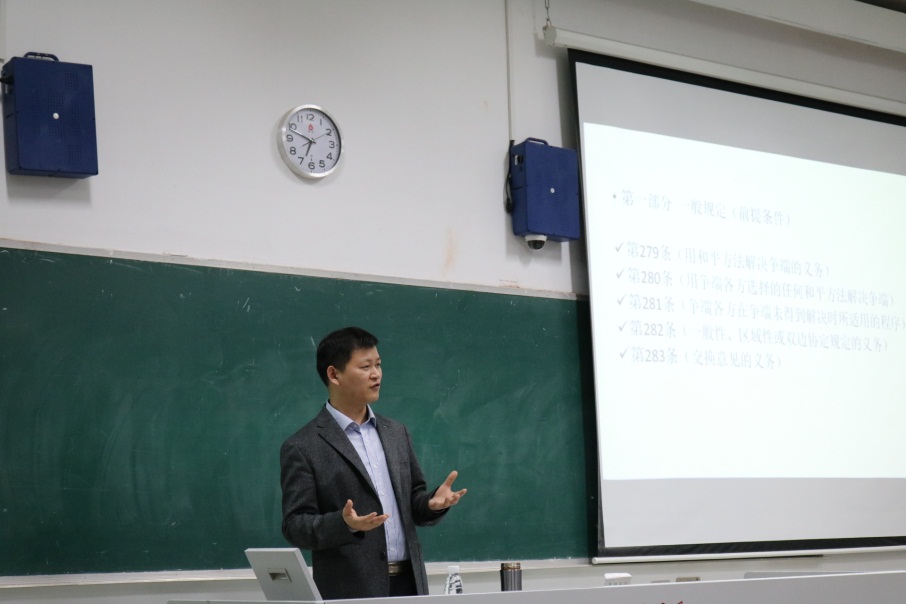 随后张华副教授为大家带来了精彩的关于南海问题的讲座。张教授一开始对联合国海洋法公约等相关国际性法律法规进行了阐释,并对南海问题作了背景性的介绍。
