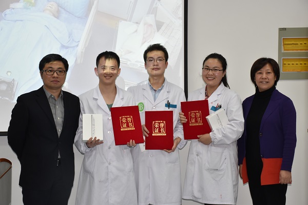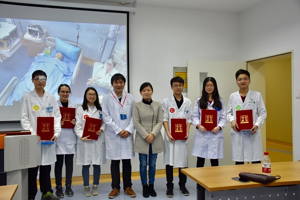 大赛以3人一组团队形式进行,共有9组同学参与比赛。比赛第一天,参赛成员进行了笔试,第二天是技能操作的比赛,分为初赛和决赛。初赛按抽签顺序进行内科、外科、妇科、儿科、急诊、护理、体检等共计8站的操作比赛,每组比赛严格计时8分钟,每站结束后轮换,直到所有组均完成8站的操作项目。初赛决出前三名进入决赛,决赛以综合模拟人考核形式,由现场随机抽签决定考核顺序,比赛时间为10分钟。经过激烈的比赛和评委们严格考核打分,大赛评选出一等奖1组、二等奖2组、三等奖6组。陈麒麟、黄艳、刘睿清三名同学以熟练精确的操作技能、良好的医学人文精神和默契的团队配合获得裁判组一致好评,摘得一等奖荣誉。刘洋、乔帅华、杨发基、王志龙、雷祎、再图那木·麦麦提明获得二等奖荣誉。
