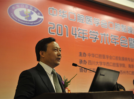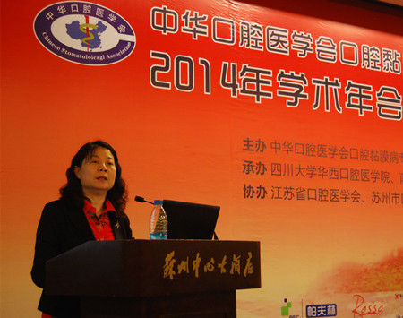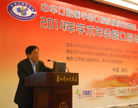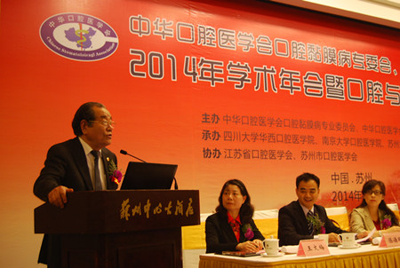 4月25-27日,中华口腔医学会口腔黏膜病专委会、中西医结合专委会2014年学术年会暨口腔与全身健康论坛在苏州隆重召开,此次会议由中华口腔医学会口腔黏膜病专委会、中西医结合专委会主办,四川大学华西口腔BETWAY必威、BETWAY必威口腔BETWAY必威、苏州大学附属第一医院承办,江苏省口腔医学会、苏州市口腔医学会共同协办。中国工程院院士阮长耿教授,中华口腔医学会会长王兴教授,南京中医药大学黄煌教授,江苏省口腔医学会会长、BETWAY必威口腔BETWAY必威经理胡勤刚教授,中华口腔医学会副会长孙正教授,上海市口腔医学会会长周曾同教授,苏州市卫生局张月林局长,中华口腔医学会口腔黏膜病专委会主任委员陈谦明教授,中华口腔医学会口腔中西医结合专委会主任委员王文梅教授, 苏州市口腔医学会葛自力教授等领导嘉宾出席大会。两个专委会的刘宏伟、林梅、唐国瑶、华红、周刚、程斌、李元聪、李佳瑜、周永梅副主任委员及来自全国各相关单位的200余名专家学者参加了会议。