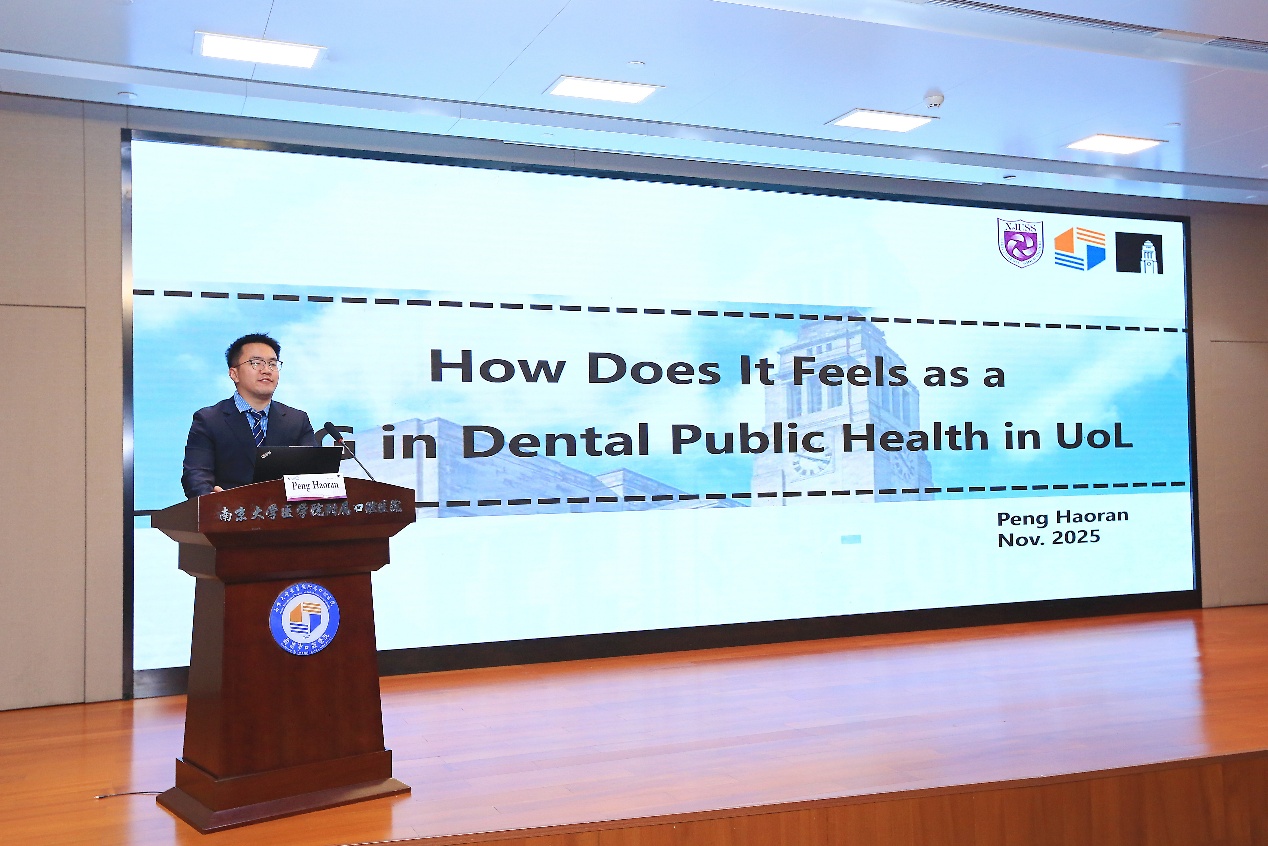 在心得分享环节,附属口腔医院综合二科医师彭浩然作为双学位项目开展以来的第一位学员,分享了他在利兹大学一年期的学习经历与收获。