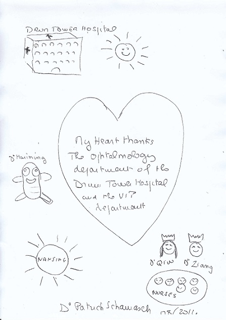 国际奥委会(IOC)前医疗官Mr.Patrick Schamasch先生8月21日工作时突发右眼视力下降,诊断为右眼视网膜脱落。8月22日鼓楼医院宁益眼科中心为他施行了“玻璃体切割联合视网膜复位术”,手术顺利,术后患者恢复良好,8月28日顺利出院。Mr.Patrick Schamasch先生对此次在鼓楼医院的就医经历非常满意,出院后特地亲自写了一封感谢信并亲手绘制了感谢卡。他在感谢信中写道:
