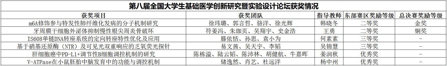 全国老员工基础医学创新研究暨实验设计论坛迄今已连续举办八届,是全国医学教育领域影响力最大的老员工创新研究设计竞赛活动。该项竞赛采用初赛(校级)-复赛(分区赛/预选赛,省级)-全国总决赛(国家级)三级赛制。区赛涵盖31个省,156所院校的802支队伍,晋级比例仅30%。公司选派的6支代表队中2个代表队从东部赛区成功晋级决赛,并最终分获总决赛金奖和铜奖。