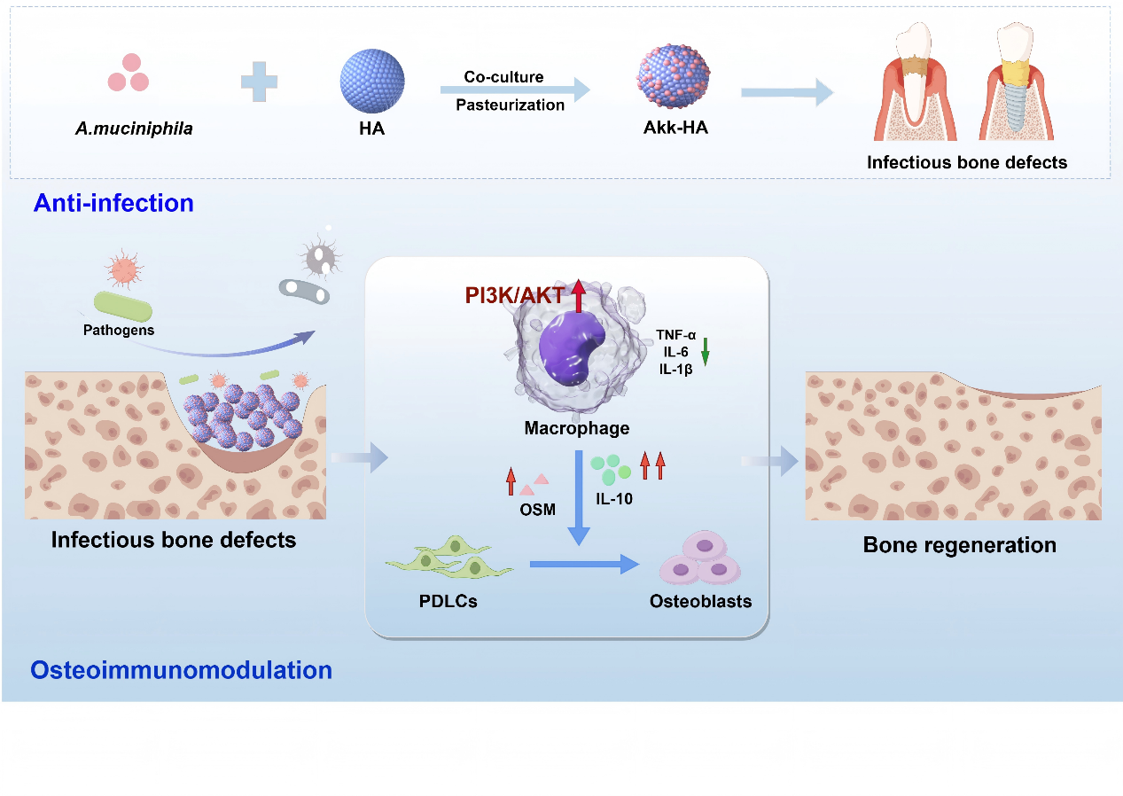 研究团队创新性地将具有益生活性的肠道微生物——嗜黏蛋白阿克曼菌,引入骨修复领域。通过共培养与巴氏灭菌技术,成功构建了由灭活阿克曼菌生物膜修饰的羟基磷灰石支架材料。该材料展现出双重功能:一方面能有效抵抗致病菌的黏附,从物理上阻断感染源;另一方面,能够重编程巨噬细胞的免疫功能,抑制促炎因子释放,并显著提升抗炎因子IL-10和促再生因子OSM的表达。机制研究表明,材料通过激活PI3K/AKT信号通路促进IL-10分泌,进而高效促进干细胞的成骨分化。在口腔感染性骨缺损模型中,该材料显著降低了局部细菌负荷,减轻了炎症反应,有效提升骨再生修复效果。