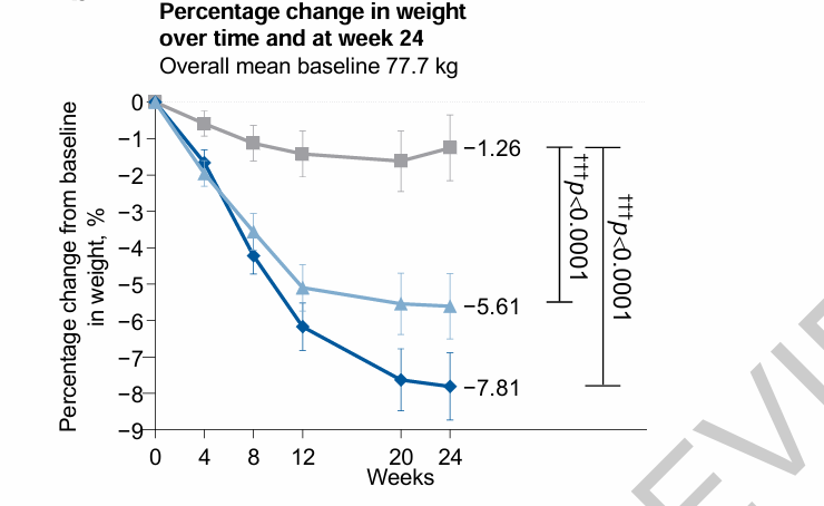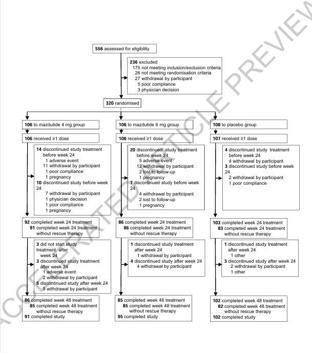 在第24周时,与安慰剂相比,玛仕度肽显著降低了糖化血红蛋白(主要终点):玛仕度肽4毫克组降低1.57%,6毫克组降低2.15%,而安慰剂组降低0.14%,治疗差异分别为-1.43%和-2.02%(两组p值均<0.0001)。体重在24周时也出现显著下降:4毫克组降低5.61%,6毫克组降低7.81%,安慰剂组降低1.26%(两组p值均<0.0001)。此外,与安慰剂组相比,玛仕度肽组有显著更多参与者达到具有临床意义的糖化血红蛋白目标(<7.0%)、减重目标(≥5%)以及复合终点(糖化血红蛋白<7.0%且体重减轻≥5%)。最常见的不良反应为腹泻、食欲减退和恶心,与GLP-1R激动剂类药物一致。