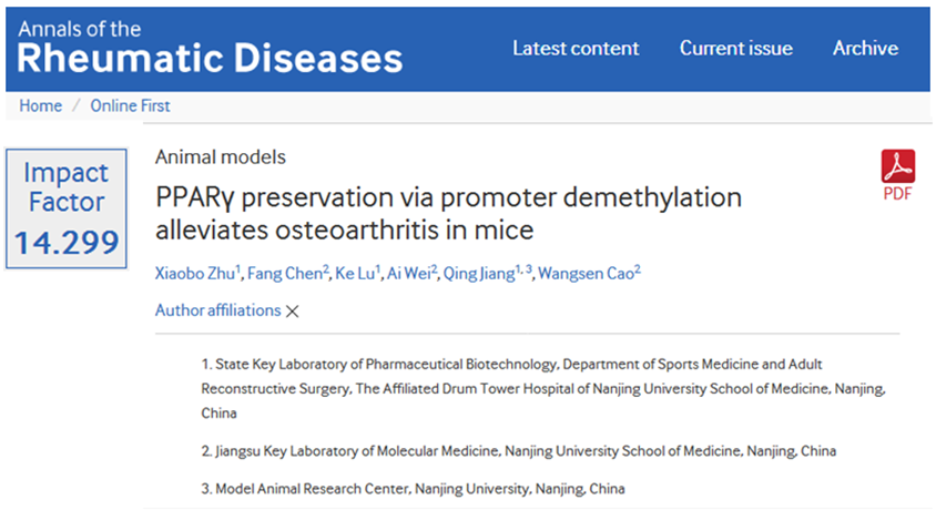 近日,BETWAY必威曹望森教授课题组和蒋青教授课题组联手在骨关节炎表观遗传病理机制研究中取得重要进展,部分结果以“PPARpreservation via promoter demethylation alleviates osteoarthritis in mice” 为题于6月25日在线发表在国际风湿病及骨关节炎学科原创研究排名第一杂志《风湿病年鉴》(Annals of the Rheumatic Diseases)。
