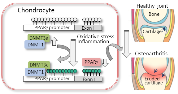 基因转录子PPAR氧化物酶体增殖物激活受体伽玛 ,Peroxisome proliferator-activated receptor gamma 是核激素受体家族成员,广泛分布于各种组织细胞,主要参与调控脂肪组织分化和代谢,同时也是重要的骨关节保护蛋白。PPAR启动子含有经典的CpG岛,是表观遗传DNA甲基化修饰的敏感位点,但PPAR是否在骨关节炎发生发展中受表观遗传DNA甲基化异常调控及功能相关性尚无报道。课题组对骨关节炎患者和小鼠膝关节内侧半月板失稳术DMM (destabilization of medial meniscus)造模的骨关节炎关节软骨检测发现PPAR蛋白水平明显下降,与野生型小鼠相比,PPAR基因敲除小鼠的骨关节炎损伤更加严重。进一步检测PPAR下降的上下游病理过程信号通路发现骨关节炎关节软骨中PPAR启动子呈现DNA超甲基化。DNA甲基转移酶(DNA methyltransferase) DNMT和DNMT3a特异性表达上升。接着,体外培养的软骨细胞和小鼠骨关节研究证实DNMT1/3a抑制剂5-氮杂-2'-脱氧胞嘧啶核苷(5Aza, 5-Aza-2'-deoxycytidine)能够有效去除IL-1及DMM诱导的PPAR启动子超甲基化,缓解PPAR下调及相关的氧化应激失衡和过度的炎症反应, 改善骨关节炎相关蛋白的表达和骨关节损伤。 进一步对野生小鼠和PPAR基因敲除小鼠的比较研究表明药理性抑制DNMT1/3a能够显著的缓解野生型小鼠的骨关节炎病理改变,但对PPAR基因敲除小鼠的保护作用不明显,说明PPAR是骨关节炎表观遗传DNA甲基化紊乱病理机制中的关键效应蛋白,其上游DNMT1/3a的异常升高能够导致PPAR启动子超甲基化及PPAR表达下降,降低了PPAR拮抗骨关节氧化应激失衡和过度炎症反应能力,最终诱导并加重骨关节炎的发生发展 (见插图)。