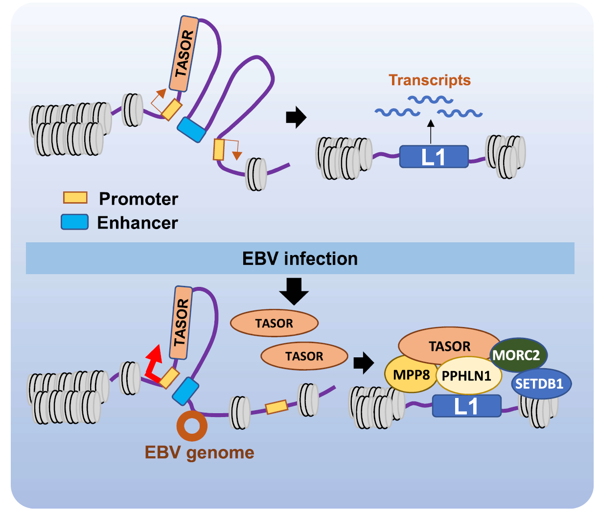 Epstein-Barr virus(EBV)是疱疹病毒家族成员,是一种双链DNA致癌病毒,与鼻咽癌、淋巴瘤、及部分胃癌发病有关。EBVaGC是一种具有独特分子特征的临床胃癌亚型,占胃癌病例的10%左右,然而EBV感染在该亚型胃癌发生发展中的作用仍不清楚。BETWAY必威何素素/李尔广团队以EBVaGC作为模型,研究了EBV感染对长散布元件LINE-1转座子表达的影响,发现EBVaGC中病毒基因组黏附于宿主HUSH复合物核心蛋白TASOR基因编码区域,导致TASOR增强子和启动子之间相互作用增强,导致TASOR高表达,进而促进HUSH复合物形成,在内含子区年轻全长LINE-1上沉积,抑制LINE-1转座子表达。人类基因组中将近50%的序列为转座子,其中LINE-1转座子占比最高,也是人类基因组中唯一具有自主转座活性的转座子,经由转录-逆转录完成转座周期,可破坏或影响插入位点基因结构和表达,在肿瘤细胞中常出现LINE-1表达失调或异常转座事件,因此可能与肿瘤发生发展有关。课题组从病毒与宿主基因组相互作用的角度阐述了LINE-1表达与EBV相关胃癌(EBVaGC)的关系,为研究病毒感染与癌症等疾病的发生发展提供了新的思路和研究方向。
