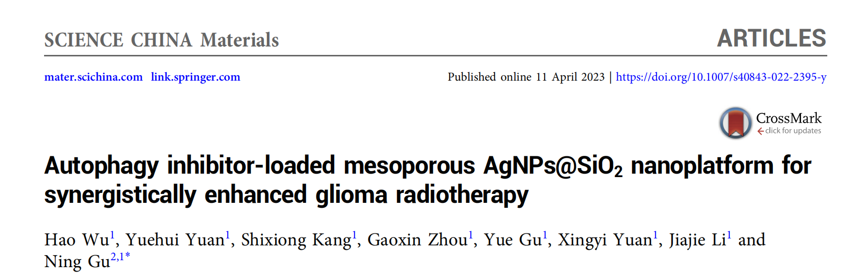 2023年4月11日,BETWAY必威顾宁教授在《Science China Materials》上在线发表题为“Autophagy inhibitor-loaded mesoporous AgNPs@SiO2 nanoplatform for synergistically enhanced glioma radiotherapy”的研究论文。这项研究为将纳米银作为与自噬抑制剂结合用于胶质瘤放射增敏提供了一个愿景,并为其临床转化提供了一种可行的策略。BETWAY必威顾宁教授是本论文的通讯作者;南京医科老员工物医学工程与信息学院吴昊博士是本论文的第一作者。