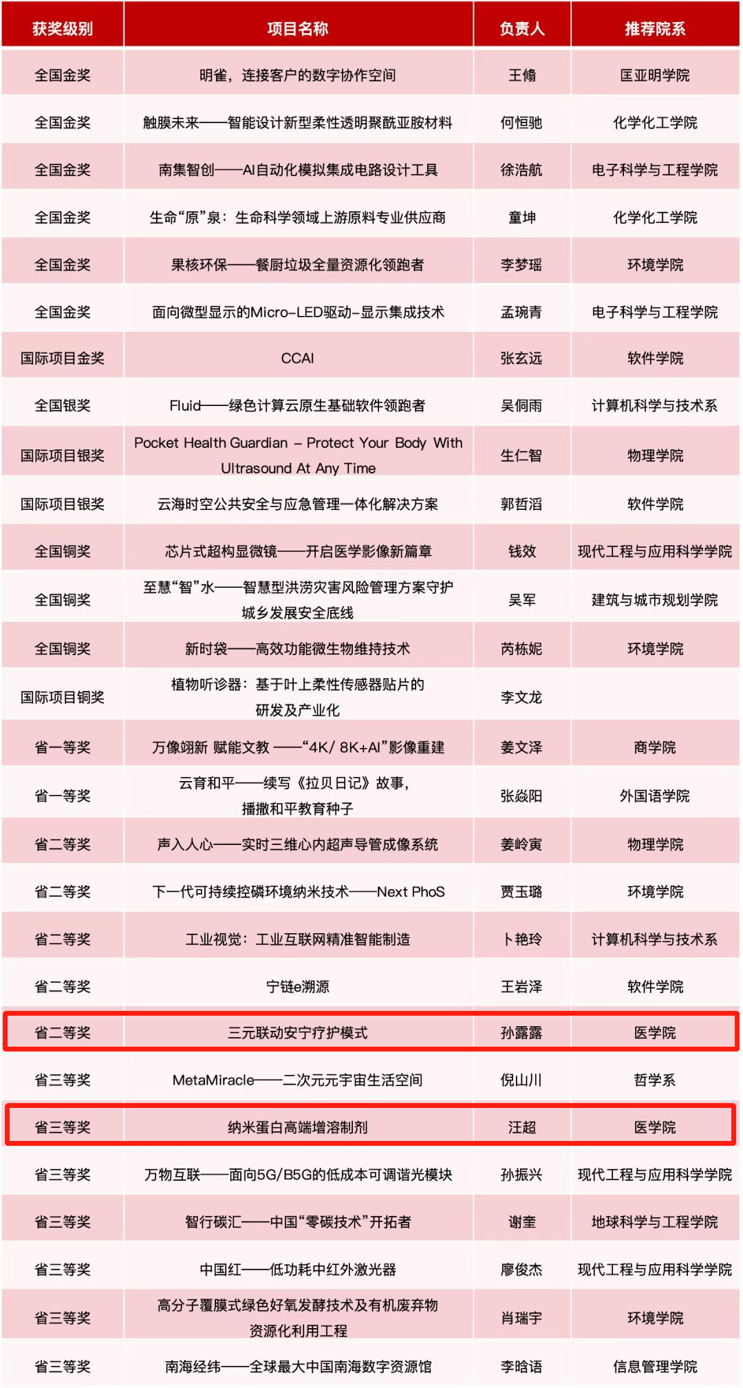 在落下帷幕不久的第八届“互联网+”大赛中,公司参赛团队斩获佳绩。在学校的悉心指导与推荐、学院老师的全力支持和参与下,经过一轮轮激烈角逐,公司“三元联动安宁疗护模式”项目在江苏省“青年红色筑梦之旅”赛道上获得二等奖;“纳米蛋白高端增溶制剂”项目在江苏省高教主赛道上获得三等奖。