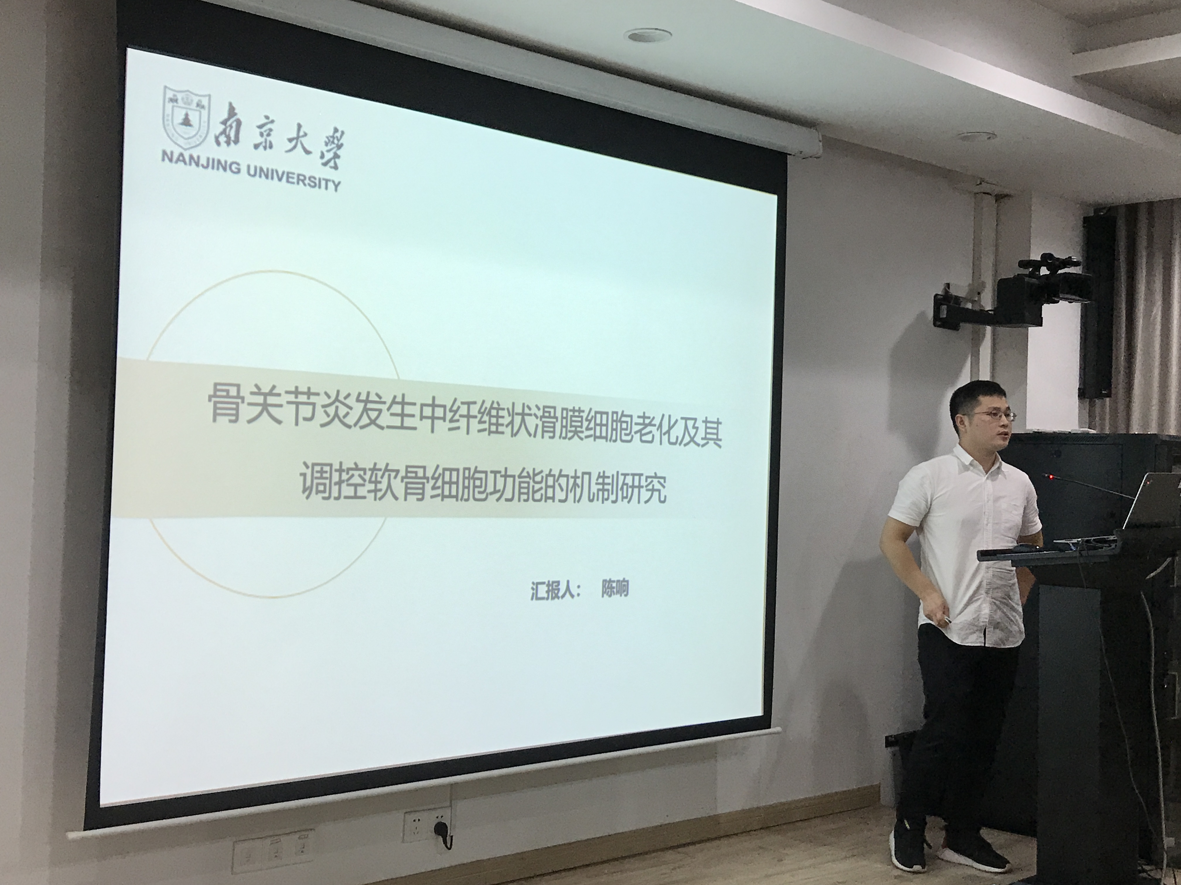 陈响老师围绕骨关节炎发生中纤维状滑膜细胞老化及其调控软骨细胞功能的机制研究这一主题的研究内容向在场的师生进行内容介绍,展开交流与讨论。