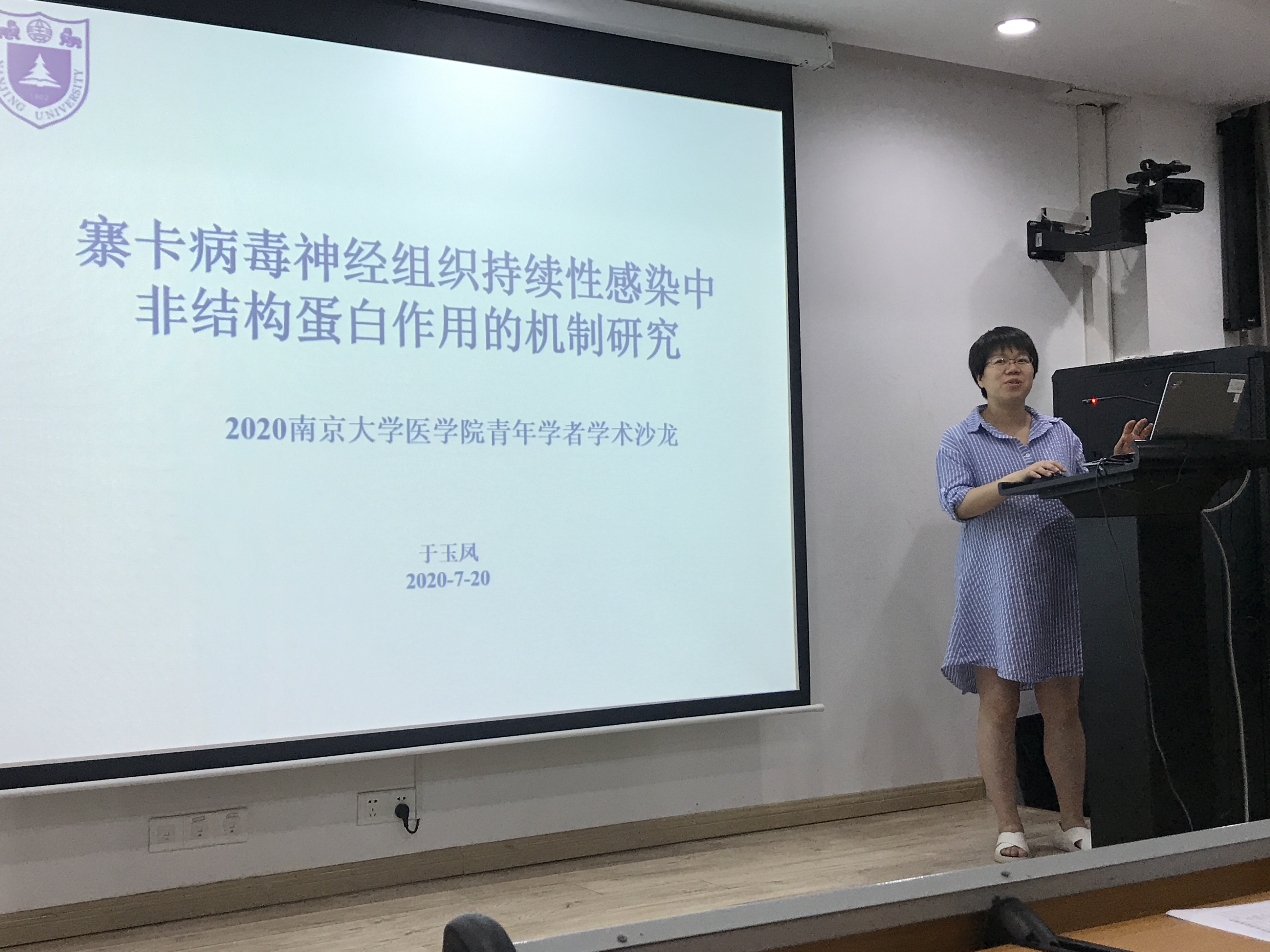 于玉凤老师对寨卡病毒神经组织持续性感染中非结构蛋白作用的机制研究这一主题研究内容进行介绍,与在场的师生展开交流。