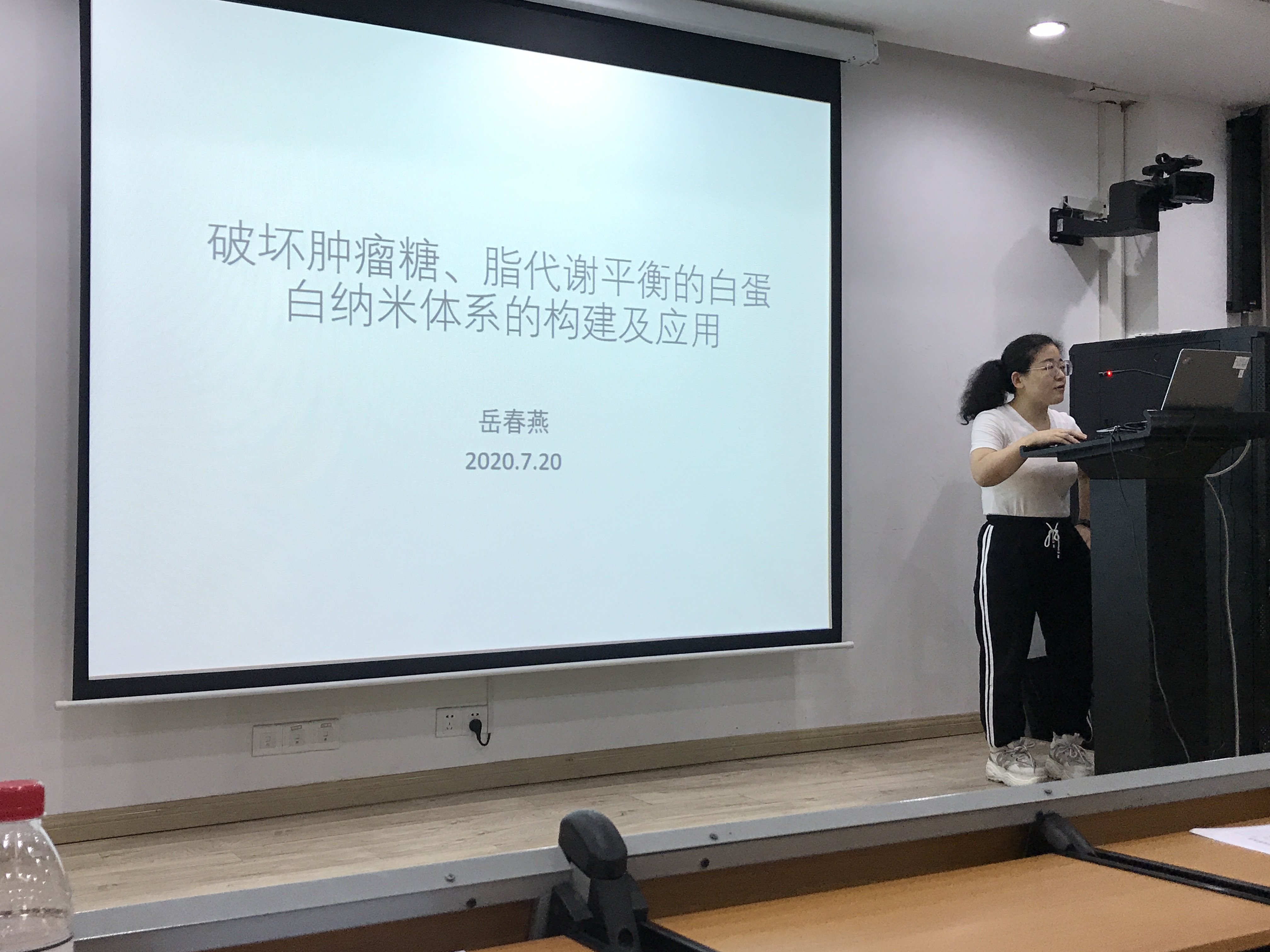 岳春燕老师围绕了破坏肿瘤糖脂代谢平衡的白蛋白纳米体系的构建及应用这一主题的研究内容向在场的师生进行介绍与交流。