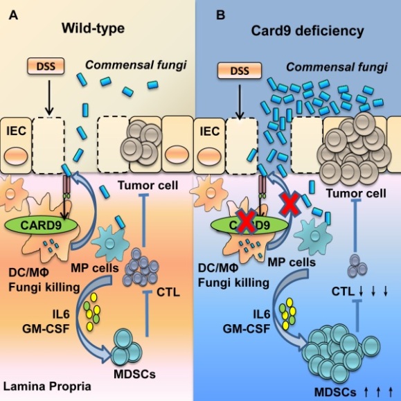 2016年,王婷婷教授回国后继续同林欣实验室合作,进一步研究肠道真菌调控结肠肿瘤进展的分子机制,研究发现上述现象与髓系抑制性细胞(MDSCs)密切相关。MDSCs是一类具有免疫抑制性的未成熟骨髓细胞,它们可通过抑制T细胞的活性促进肿瘤的生长。MDSCs增多导致的免疫抑制已成为肿瘤患者预后差、治疗效果不理想的重要原因。该研究发现在Card9-/-结肠肿瘤鼠中MDSCs的比例,尤其是粒样的髓系抑制细胞(G-MDSCs)显著增多,且MDSCs对CD4+ T细胞和CD8+ T细胞的抑制能力显著增强。进一步的实验首次证实肠道真菌的刺激可以促进髓系细胞向MDSCs的分化,并激活MDSCs的免疫抑制活性。