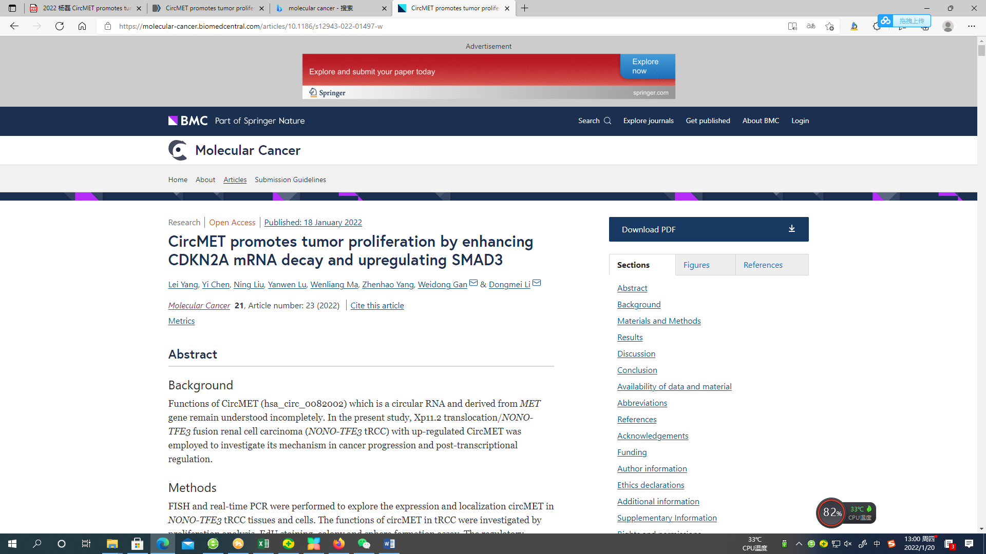 2022年1月18日,BETWAY必威李冬梅/甘卫东团队在Molecular Cancer杂志上发表文章《CircMET promotes tumor proliferation by enhancing CDKN2A mRNA decay and upregulating SMAD3》,通过利用新兴分子生物学技术详细阐述了circMET在肿瘤中调控细胞增殖的功能及机制。