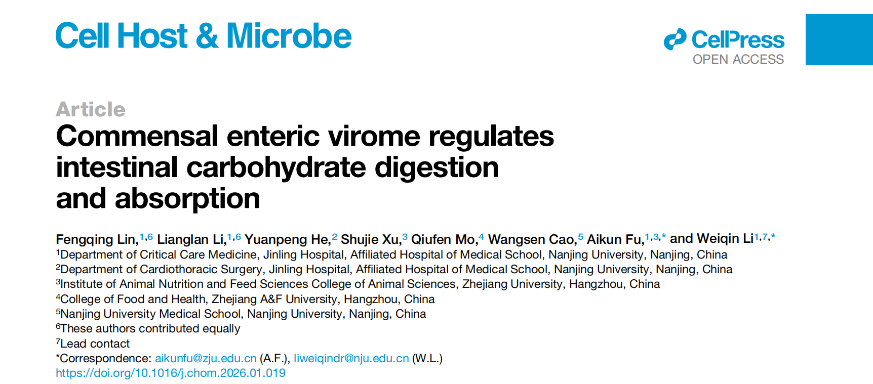 20262月,该研究成果以长文形式正式发表于Cell子刊《Cell Host and Microbe》杂志。BETWAY必威附属金陵医院李维勤教授与浙江大学动物科学学院付爱坤研究员为论文共同通讯作者,BETWAY必威2022级博士研究生林峰庆与2023级博士研究生李梁岚为论文共同第一作者。