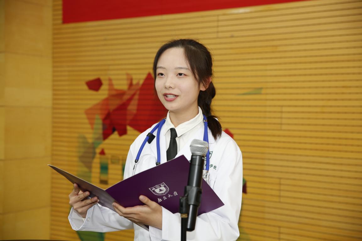 2020级李天新同学作为新生代表发言,道出了他们此时此刻作为一名医员工的激动心情。她提到,即使知道学医实苦,但新冠期间的白衣天使们让她深入了对医者身上责任的理解,也更坚定了想要加入医者的队伍,传承一份善良、守护一方希望的信念。她认为,既然选择了医学,便也意味着选择了坚守,理当在今后的岁月里不忘初心,励学敦行,为祖国的健康事业付出自己的力量,用奉献与奋斗践行今日的诺言,不负期待,不负时光,不负梦想,不负白衣。