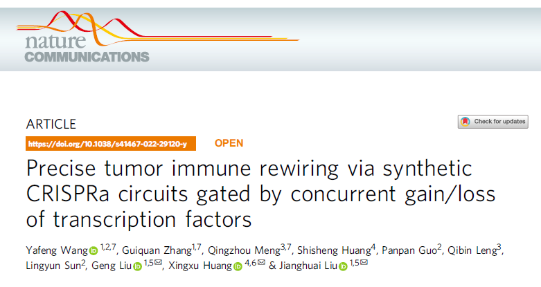2022年3月18日,BETWAY必威模式动物研究所、医药生物技术国家重点实验室成员团队协同上海科技大学、南京市鼓楼医院等合作单位在《自然-通讯》杂志(Nature Communications)发表了题为“Precise tumor immune rewiring via synthetic CRISPRa circuits gated by concurrent gain/loss of transcription factors”的研究论文。该研究首次构建了响应肿瘤细胞中转录因子信号同时获得和丢失的CRISPRa基因环路,一方面能精准识别肿瘤,另一方面能恰当启动抗肿瘤免疫,产生特异及有效的治疗效应。