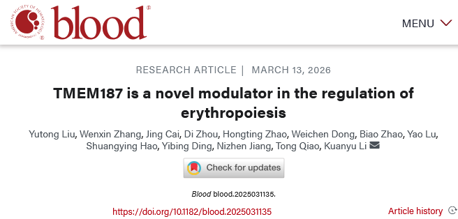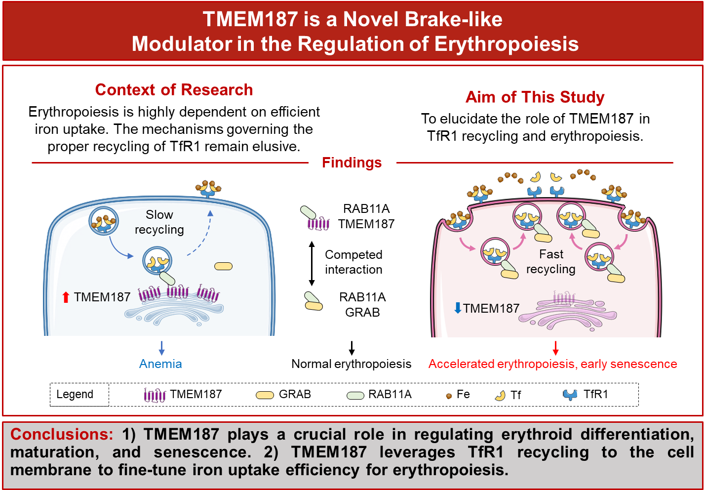 2026313日,该研究在《Blood》杂志上在线发表,题目为“TMEM187 is a novel modulator in the regulation of erythropoiesis。该研究首次揭示了功能未知的跨膜蛋白TMEM187在红系分化过程中的“刹车”功能,明确了TMEM187通过竞争性抑制GRAB-RAB11互作,精准调控TfR1回收铁的效率,为铁代谢与红细胞生成的调控网络增添了新节点。