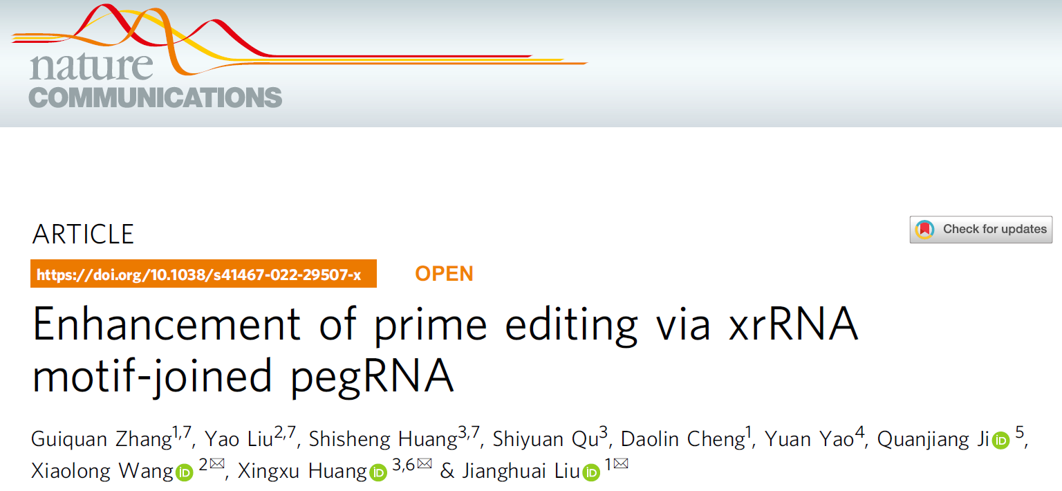 2022年04月06日,这篇题为“Enhancement of prime editing via xrRNA motif-joined pegRNA”的论文发表于《自然-通讯》杂志(Nature Communications)。该工作的第一作者(共同)为BETWAY必威模式所博士生张贵泉、刘尧(西北农林科技大学)和黄诗圣(上海科技大学);通讯作者分别为刘江怀、黄行许(上科大)与王小龙(西农)教授。研究工作受到科技部重点研发计划等项目的资助。