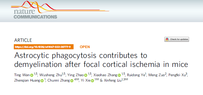 2022年3月3日,BETWAY必威附属金陵医院BETWAY必威神经病学研究所(东部战区总医院神经内科)刘新峰教授、谢怡博士后和和张春妮教授团队在国际著名综合性期刊Nature Communications(IF 14.919)在线发表文章《Astrocytic phagocytosis contributes to demyelination after focal cortical ischemia in mice》,揭示了造成急性缺血性卒中后继发性脱髓鞘损伤可能的分子机制。