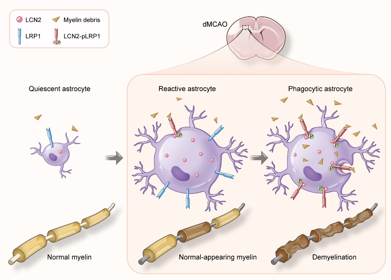 研究团队采用左侧远端大脑中动脉永久闭塞的模型造成小鼠左侧大脑皮质局部缺血性梗死,取非缺血区胼胝体研究星形胶质细胞表达的LCN2在继发性胼胝体损伤中的关键作用。研究结果表明,野生型小鼠胼胝体确有严重脱髓鞘改变,该部位星形胶质细胞高表达LCN2,且LCN2阳性的星形胶质细胞具有吞噬髓鞘碎片的功能。而Lcn2-/-小鼠的星形胶质细胞吞噬功能受限,脱髓鞘损伤也较轻。本研究还使用慢病毒转染的方法使Lcn2-/-小鼠胼胝体区星形胶质细胞特异性表达非分泌型LCN2(Δ2-20),通过对星形胶质细胞吞噬功能和胼胝体脱髓鞘损伤严重程度的分析,进一步确定了胞内LCN2在继发性脱髓鞘病变中的重要地位。为了解析可能的下游分子机制,本研究通过免疫共沉淀的方法确认造模后LCN2和介导细胞吞噬作用的受体LRP1结合增加,导致LRP1磷酸化,激活下游吞噬活化相关通路,从而调控星形胶质细胞的吞噬功能。而用LV-Lrp1-RNAi的方法抑制LRP1表达可以减轻LCN2诱导的星形胶质细胞对髓鞘碎片的吞噬功能,并延缓胼胝体脱髓鞘进程。因此,本研究证明内源性LCN2可以通过与LRP1结合激活吞噬信号通路促进星形胶质细胞吞噬髓鞘碎片的能力,最终造成缺血后继发性胼胝体脱髓鞘病变(图一)。