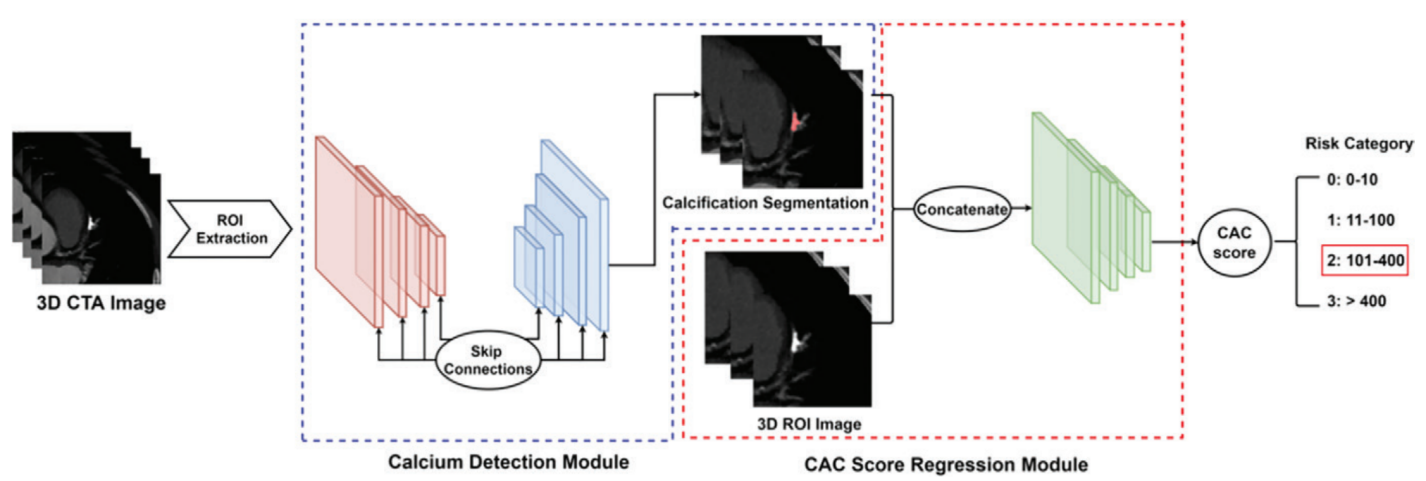 模型创新:该研究采用先进卷积神经网络,采用了两个模块检测模块和钙化分数回归模块,在保证准确钙化检测同时直接从图像中进行分数回归。