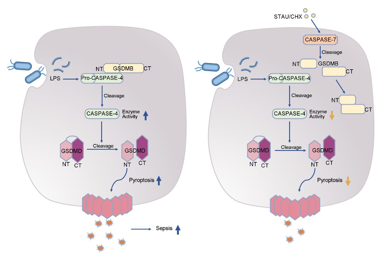 综上所述,本研究发现并阐明了通过caspase-7/GSDMB通路实现的凋亡对非经典焦亡的抑制作用。由于在非经典焦亡过程中,GSDMB能够结合caspase-4并增强其酶活性,因此GSDMB是脓毒症的潜在促炎因子。而caspase-7激活后能够抑制GSDMB对非经典焦亡的促进作用,避免细菌感染过程中免疫反应的过度激活以实现自我保护,因此caspase-7/GSDMB通路有望作为潜在靶点,为临床上脓毒症的治疗提供新的治疗策略。
