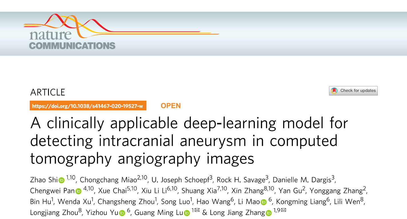 该研究成果近日在国际顶尖期刊Nature Communications(IF 12.121)在线发表,文章题目为“A Clinically Applicable Deep Learning Model for Detecting Intracranial Aneurysm in Computed Tomography Angiography Images”(用于检测CT血管成像上颅内动脉瘤的临床应用型深度学习模型)。张龙江、卢光明教授提供了研究的设计思路,时刻关心课题进展,不断提出改良意见,大力推进实验进展,为论文的共同通讯作者;BETWAY必威2017级硕士研究生施昭(导师:张龙江教授)为论文第一作者。该研究受到国家自然科学基金重点项目、科技部国家重点研发计划数字专项等基金的资助。
