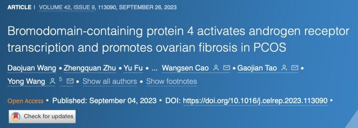 2023年9月4日,BETWAY必威王勇教授、曹望森教授团队在Cell Reports杂志发表了题为“Bromodomain-containing protein 4 activates androgen receptor transcription and promotes ovarian fibrosis in PCOS”的论文,该研究揭示了乙酰化“阅读”蛋白BRD4促进AR转录活化是PCOS卵巢纤维化的重要表观遗传学旁路。BETWAY必威王勇教授、曹望森教授和附属鼓楼医院陶高见主任为本论文的共同通讯作者,BETWAY必威博士研究生王道娟为本论文的第一作者。本研究得到了国家自然科学基金(#82201795,81971346)的资助。王道娟博士为本研究的第一作者。