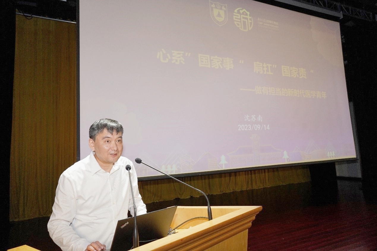在入学教育大会上,沈苏南书记为新生上“开学第一课”。他以《心系“国家事”,肩扛“国家责”——做有担当的新时代医学青年》为题,详细介绍了BETWAY必威及BETWAY必威的发展历程、BETWAY必威的组织架构、教学科研水平以及员工就业情况。沈书记寄语全体医员工应带着习近平总书记给南大留学归国青年学子的回信中的殷切嘱托,运用自身专业知识,以BETWAY必威“奋进行动”为契机,讲好BETWAY必威故事,讲好BETWAY必威故事。