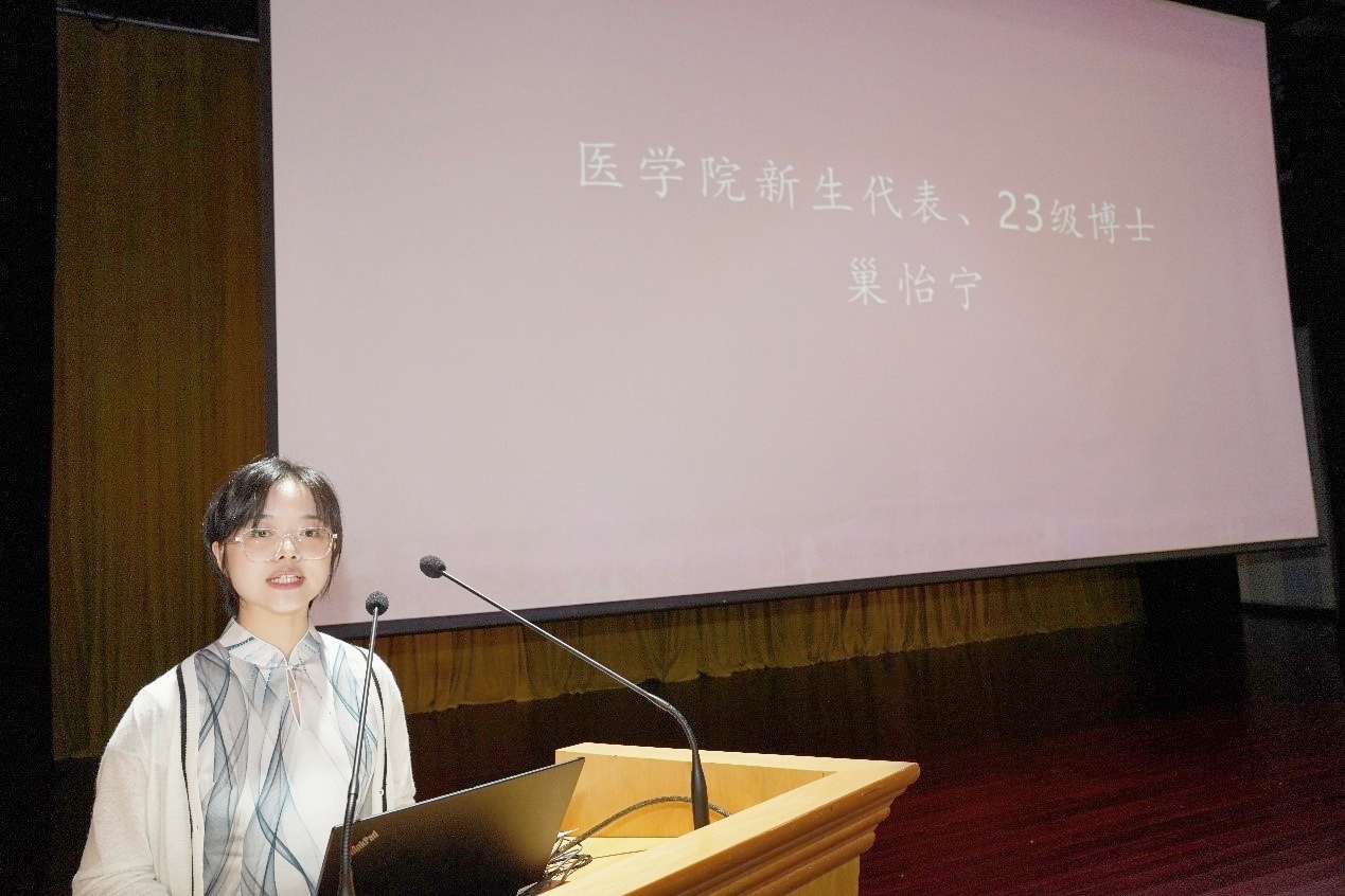 新生代表2023级博士研究生巢怡宁发言。她表示,各位研究生新生要时刻牢记自己为追求梦想而来,为推进祖国医药事业发展而来,勇立时代潮头,争做时代先锋,立志为人类身心健康事业添砖加瓦。
