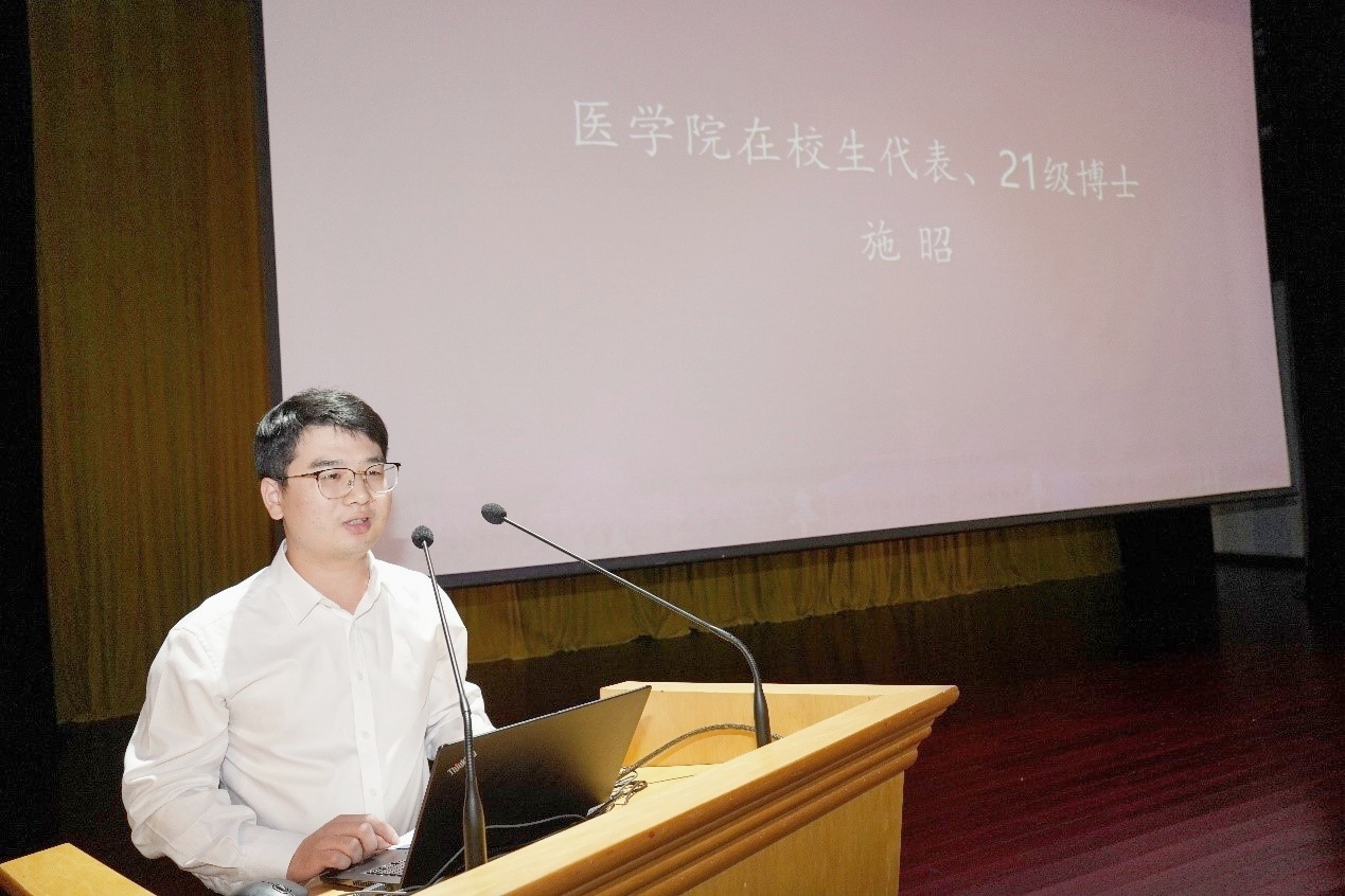 2021级博士研究生施昭作为在校生代表发言。他以亲身经历为例,鼓励同学们勇于尝试,接触新的事物,不断突破自己。他表示,要时刻谨记初心和南大的期许,要敢于尝试,实现自我超越。
