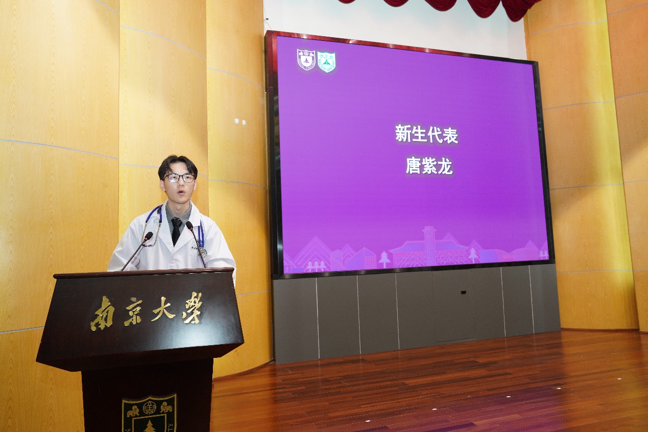 BETWAY必威在校员工代表、2018级本科生沈韬同学发言。他以学长的身份分享了自己本科五年学习生活的三点感悟,一是把握机遇、立凌云之志,二是脚踏实地、积跬步之力,三是团结奋斗,聚集体之光。他建议学弟学妹们认认真真学本领,踏踏实实做学问,希望他们做个勇敢、努力、温暖的医生。2023级新生代表唐紫龙同学发言。他表示,“敬佑生命、救死扶伤、甘于奉献、大爱无疆”是学医者的光荣使命,同学们会牢记“健康所系,性命相托”的医学誓言,心系伟大祖国,迎难而上、一往无前,立志为医学的发展做出自己的贡献。