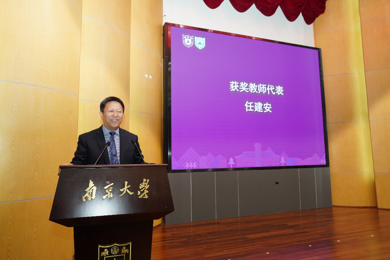 获奖教师代表任建安发言。任建安老师指出,作为教师要帮助员工实现两个方面的转变,一是在学习上实现从过去的背题到现在的研究性学习模式的转变,二是在身份上实现从普通民众到神圣医生的转变。“向高处立、就平处坐、从宽处行”,努力培育杰出的医学人才。