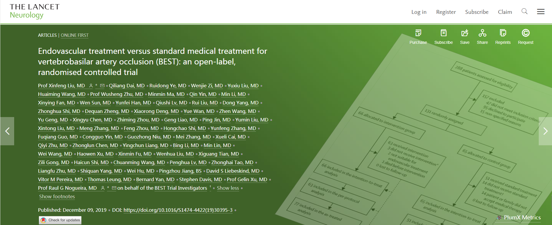日前,由BETWAY必威BETWAY必威附属金陵医院(东部战区总医院)神经内科刘新峰教授牵头的一项国际大型多中心随机对照临床试验——急性椎基底动脉闭塞性卒中血管再通研究(BEST研究),该研究为椎基底动脉闭塞所致后循环卒中血管内治疗提出了新的思路,研究成果于2019年12月9日在国际顶级杂志子刊-柳叶刀神经病学(The Lancet Neurology, 影响因子28.755) 在线发表。BEST研究是中国第一项发表于国际顶级杂志子刊,关于血管内治疗急性大血管闭塞卒中的临床试验。该研究填补了椎基底动脉取栓试验的国际空白,相关结果提示血管内治疗可能优于单纯药物治疗。