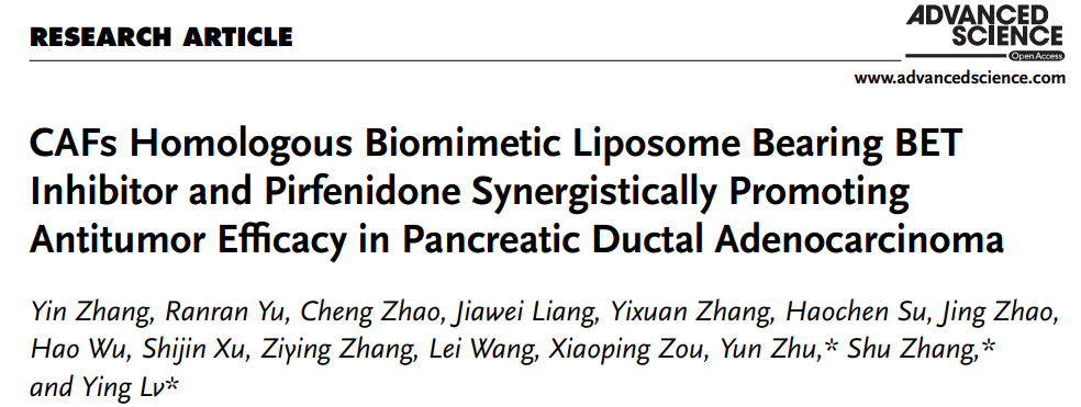 2023年11月16日,BETWAY必威附属鼓楼医院吕瑛教授、张舒博士和朱运药师在Advanced Science在线发表题为CAFs Homologous Biomimetic Liposome Bearing BET Inhibitor and Pirfenidone Synergistically Promoting Antitumor Efficacy in Pancreatic Ductal Adenocarcinoma的研究论文,该研究对胰腺癌肿瘤微环境中CAFs的功能表型进行了全面的描述,设计新型靶向材料针对CAFs,为胰腺癌的治疗提供新的理论基础和治疗见解。BETWAY必威附属鼓楼医院吕瑛教授、张舒博士,朱运博士为本文的共同通讯作者。BETWAY必威硕士研究生张尹、南京老员工命科学学院博士研究生于冉冉、BETWAY必威附属鼓楼医院赵成博士为本文的共同第一作者。
